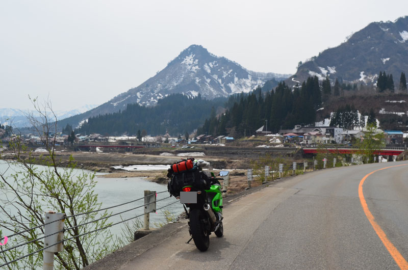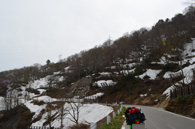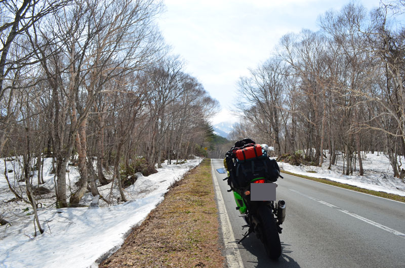 | あの先の山の峠を越えるらしい。ツーリングマップルを見ると、「日本有数の豪雪の峠」や、「残雪の山岳風景がすごい!」との記載があるが、本当にあの山を越えれるのか心配になってきた。(山は真っ白!) |