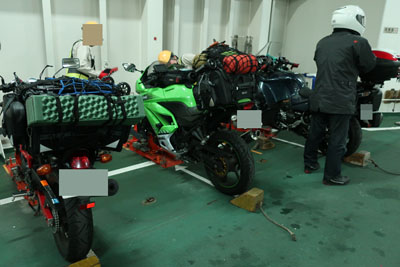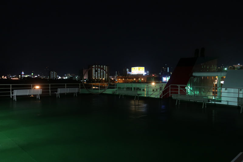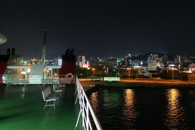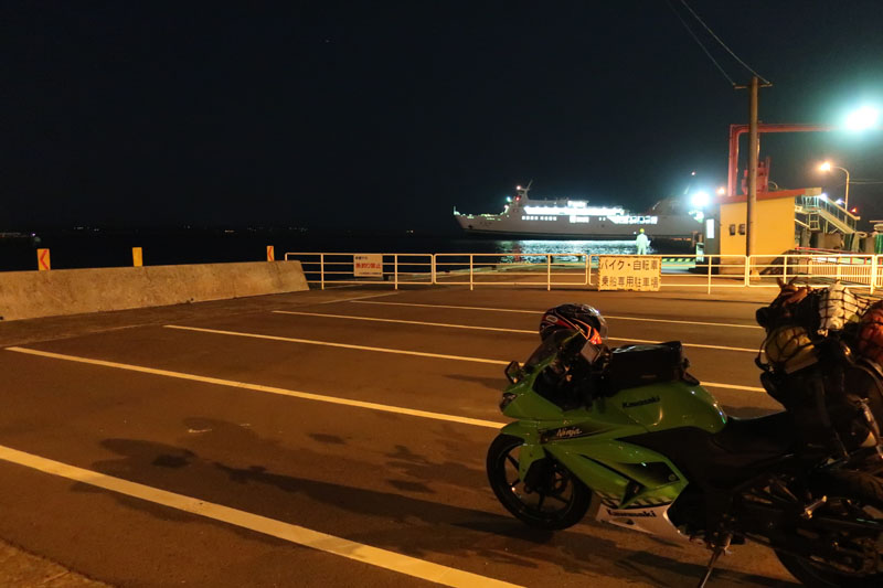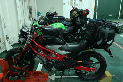 | フェリーが20時10分に着岸してすぐに入船できると思ったが、30分も待たされたのちに入船する。国道九四フェリーならすぐに入船だけどね。今日は我々以外のバイクは佐賀ナンバーの1台のみ。 |
