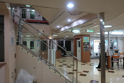 フェリーの中は結構広い。このフェリー、2500トンほどで結構大型。国道九四フェリーは最大1000トンだからね。(いつも国道九四フェリーだからついつい比較してしまう) |