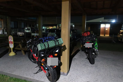 フェリーから下船後、港のすぐ横にある道の駅に寄ってみたところ、幸いなことにベンチと屋根がある場所があったので相棒と相談して今日はここで野宿することで決定。(既に先客2人がいたので入りやすかった) これならテントは出さなくてもシュラフだけで眠れそうだ。 |