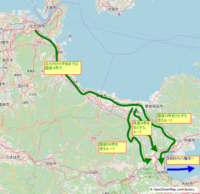 まずは別府に向けて出発する。北九州からに別府に入る場合、基本は国道10号で宇佐市まで走り、宇佐市から国道500号を使って山越えするか、県道経由で山越えするか(最短ルート)、国道10号をひたすら走るか(最長ルート)の3つのルートになる。今回は国道10号でのんびりと別府に向かうことにした。