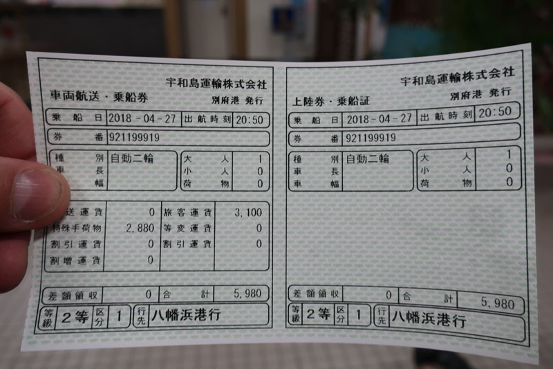 北九州から3時間ほど走って別府港までやってきた。相棒とインカム越しに会話をして結局今日はフェリーが空いている宇和島運輸(別府~八幡浜)で四国に渡ろうということになった。 |