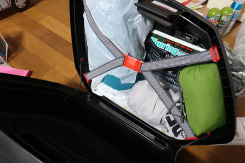 パニアがあるので雨に濡れて困るものや貴重品はパニアへ。衣服や最悪、濡れてもいいものはシートバックへ。