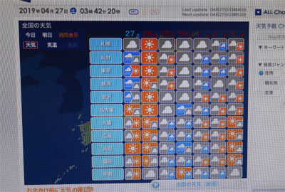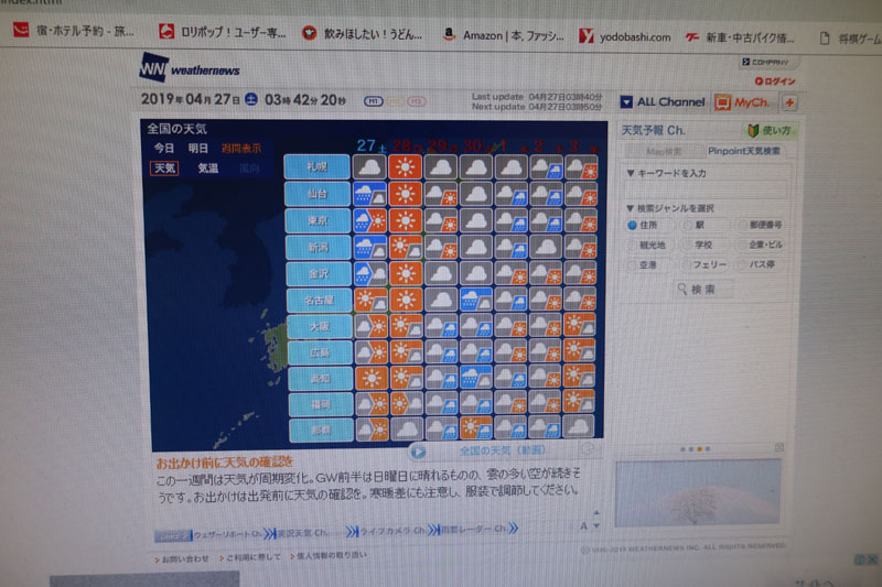朝4時前に起きてウェザーニュースで天気を確認すると、今日の山陰の天気は曇り一時晴れ。真っ暗な外を見ても雨が降っている様子はなく、昨日と変わらず一安心。ただ、ゴールデンウィークの中頃に2~3日天気が崩れる予想は変わらず。