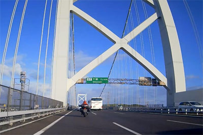 | 北九州(戸畑)から門司港までのんびりと下道で走り、門司港から高速道路に入る。関門橋を渡る頃には天気が良くなってきた。ただ、気温が思ったより低く、ネックウォーマーを忘れた相棒は少し辛そう。 |