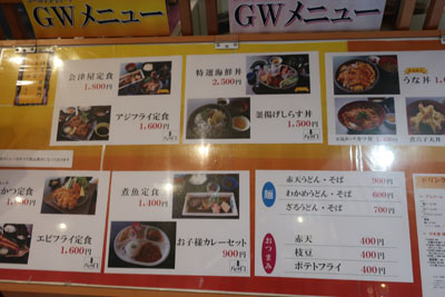 お腹が空いたので食事処を見てみるが、結構な観光地値段。しらす丼が1500円は高いなあ。エビフライも1600円、かつ丼も海鮮丼も明らかに他より500円は高い印象。写真を見てもとても期待できないのでパス。