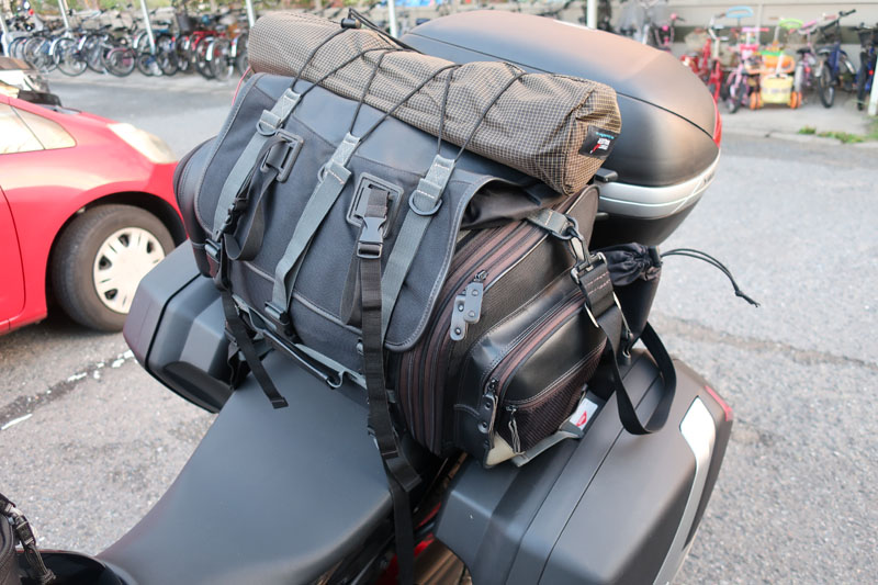 あとは着替えやキャンプ用品を入れているTANAXのシートバックも念入りにセッティング。Ninjaのときはシートバックだけだったので、シートバックは腰が抜けるほど重かったけど、今回は軽量。ただ、コットは横長くてシートバックに入らなかったのでシートバックの上へ設置した。 |