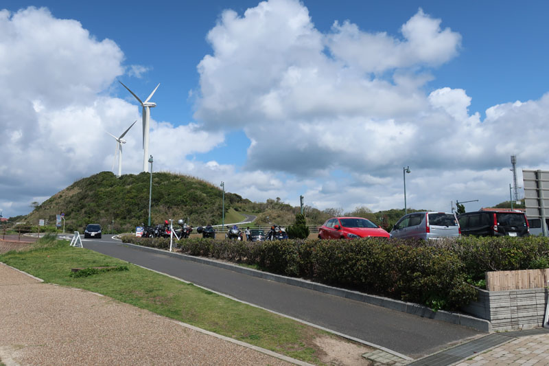 | そのうちに道の駅「キララ多伎」に到着。ここは風車が回っていて、海も綺麗で天気の良い日だとロケーションは最高。バイクとすれ違うことも多くなってきた。 |