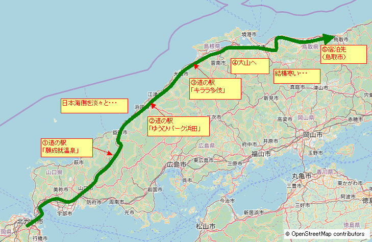 小郡ICで高速道路を降りて国道9号をひたすら北上する。九州から関西圏に行く場合は、高速道路だと山陽道より中国道、下道だと国道2号より国道9号が定跡。両方とも50キロぐらい遠回りになるが、広島、福山、岡山、姫路などの都市圏に入ると渋滞も酷いので、人口が少ない地方を走るほうが全然早いし疲れない。でも冬は中国道、国道9号ともに積雪の心配があるので御注意を。