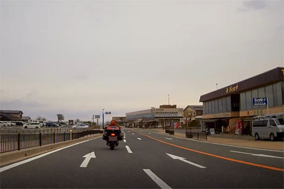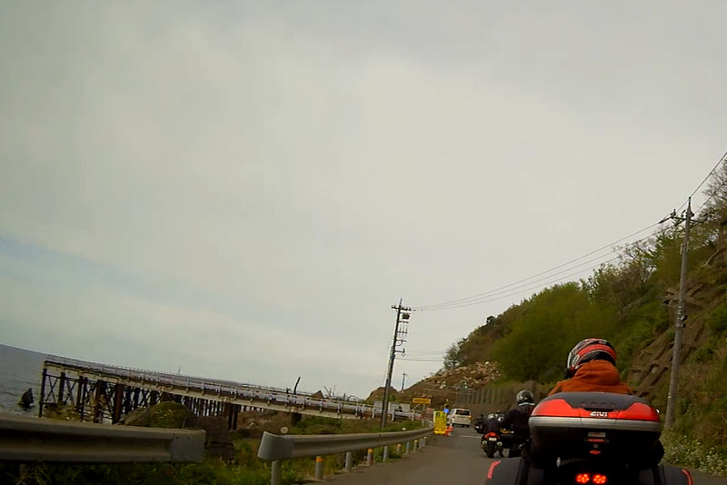 呼鳥門を出て福井市に入った先に海に向かって仮設のコの字の道路が!崖崩れで道路が封鎖されたのだろう。しかし、仮設とはいえ、結構海の上を通っていて、仮設といえどもこれを作るのに相当な時間と費用を要したのでは? |