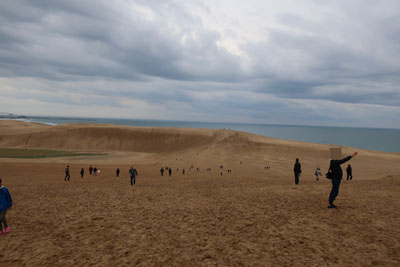 朝早いのに鳥取砂丘には既に大勢の人が歩いている。しかし、雲が厚くて青い空が見えないなあ。