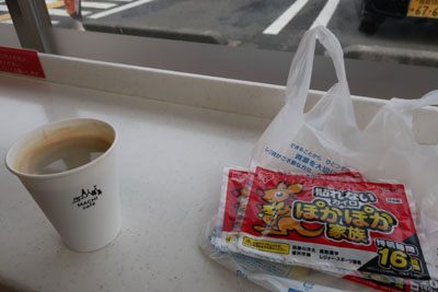 コンビニで購入したのは使い捨てカイロとホットコーヒー。
