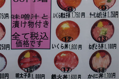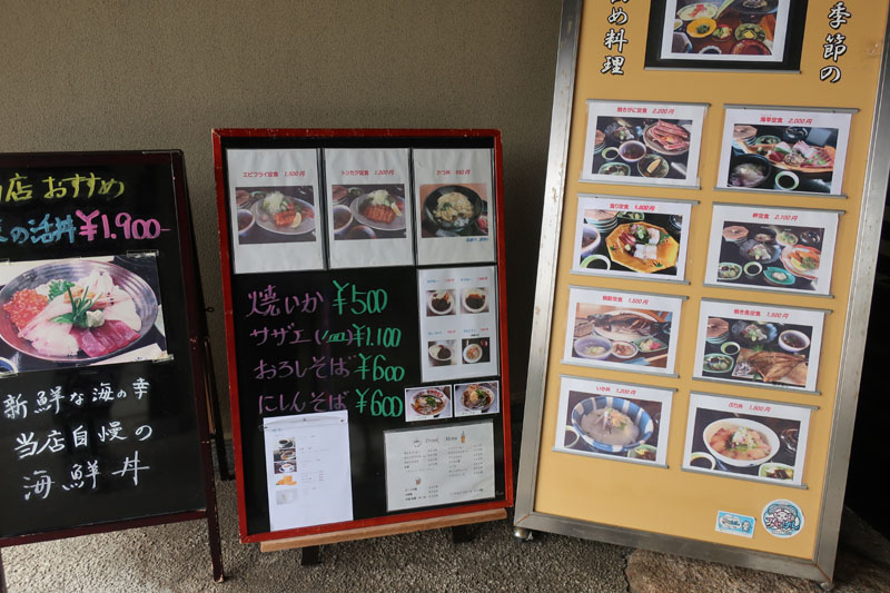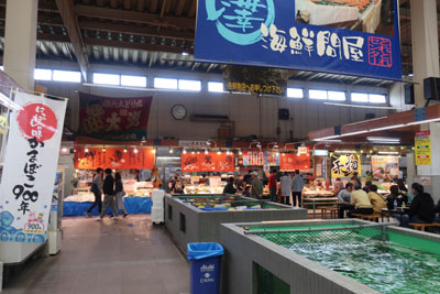 | 道の駅に入ると中は広い。名前のとおり、海の幸を豊富に扱っていて見どころは多そう。でも価格は地元向けではなくて観光地価格といったところ。道の駅も地域密着化と観光地化が分かれていて、いずれも一長一短といったところか。 |