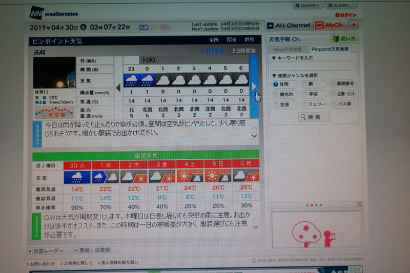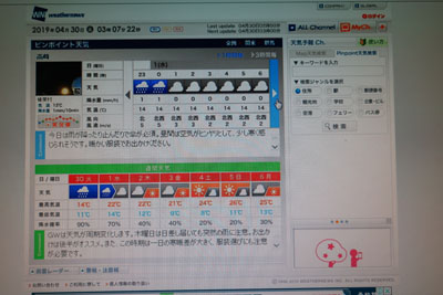 | 気になる明日の天気だが、明日も雲が多く、太平洋側は大雨らしい。うーん、富士山周辺に行きたかったけど、完全に足止め。新潟や長野方面なら少しはマシらしい。困った。 |