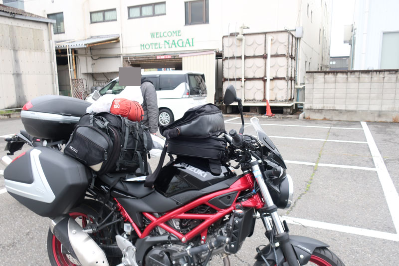 1時間半ほど走って高崎市のホテル「ナガイ」に到着。駐車場が広いのがいい。高崎に入ることに雨が止んできて一安心。しかし、バイクは雨でドロドロ。チェーンも気になるよ。 |