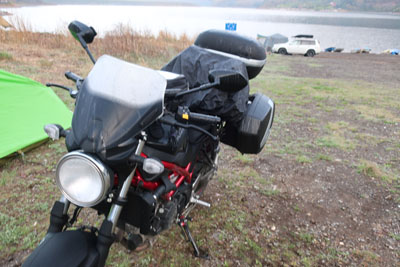 | SV650は夜露でびしょびしょに濡れていた。シートバッグにバイクカバーを付けていてよかったよ。素の状態なら中にある衣服も完全に湿っていたと思う。 |