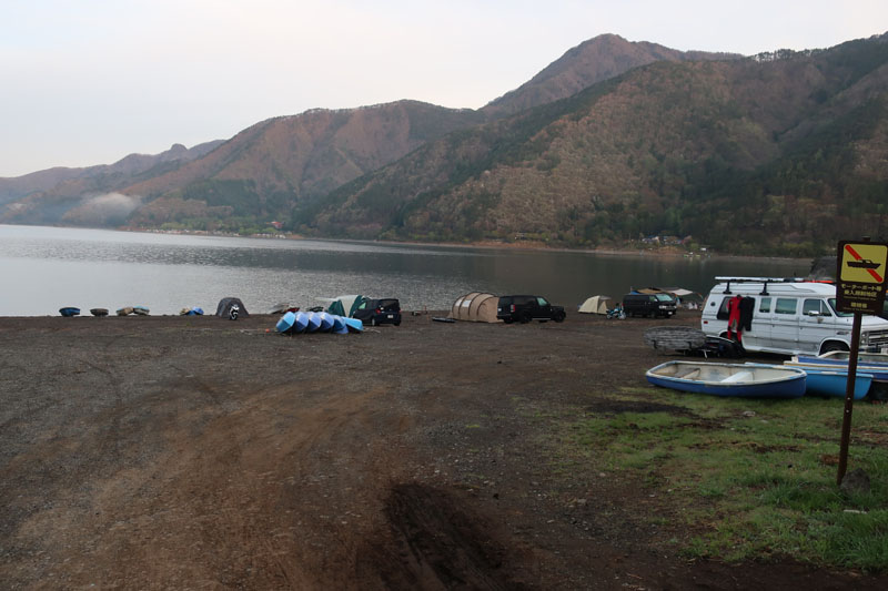 西湖オートキャンプ場はゴールデンウィークでも疎(まば)ら。富士山が見えないのであまり人気がないのだろうか。ここはトイレも綺麗で湖も見えるし広くて快適なので玄人好みのキャンプ場といえる。 |