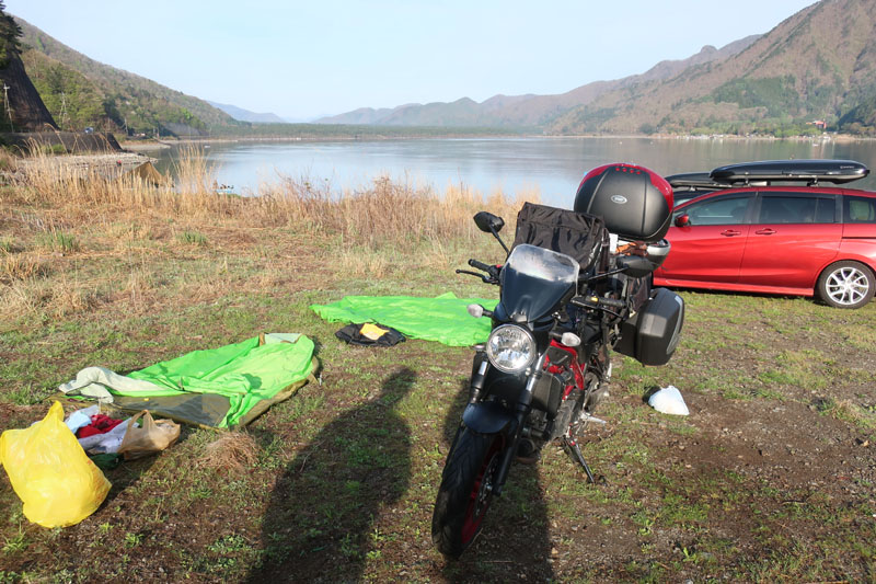 夜、眠りが浅かった。5月とはいえ思った以上に寒く、シュラフの上にジャケットを被せて寝たので少し重かった。湖の真横というのも寒さに和を掛けていると思う。ボクが持っているモンベルのシュラフは0℃が快適ギリギリらしいので、これぐらいが限界。今回、コットを初めて使ったけど、凄く快適だった。エアーマットはもう要らないね。