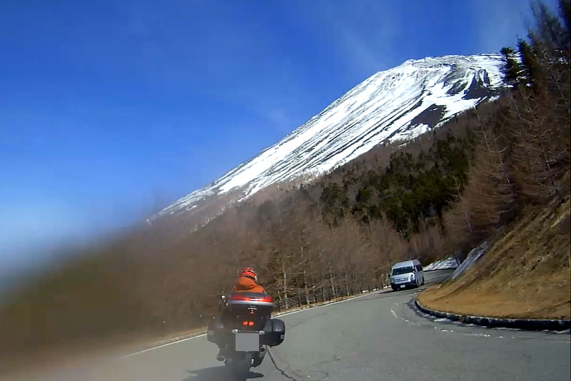 こちらの道路は山梨側の富士スバルラインと違って全線無料。路面は富士スバルラインのほうが走りやすくはあるが、適度なカーブが気持ちいい。カーブが続く道こそバイクで走る特権やね。 |