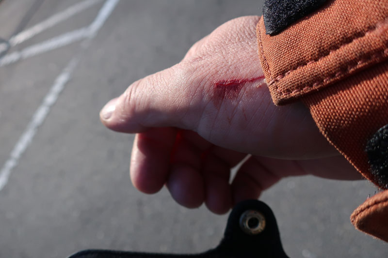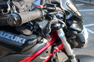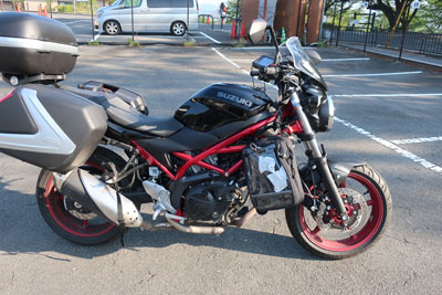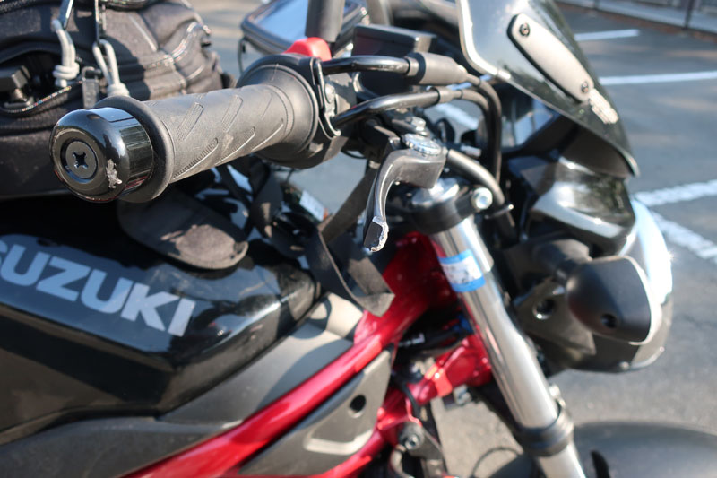 サイドケース傷(右)、ステップバー(右)が一部破損(運転に支障はない)、クラッチバー(右)が1/3破損(運転にはかろうじて破損なし)、ハンドルの丸い部分の塗装剥げ、ボクの右手の親指の付け根が擦り傷(ちょっと大きめ)、シートバッグの紐(右)がちぎれて破損。車体自体に影響がなかったのが不幸中の幸いだった。