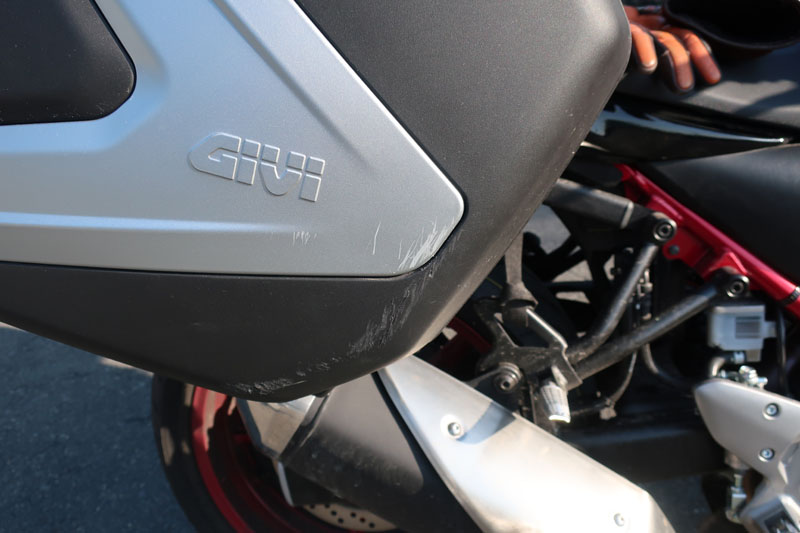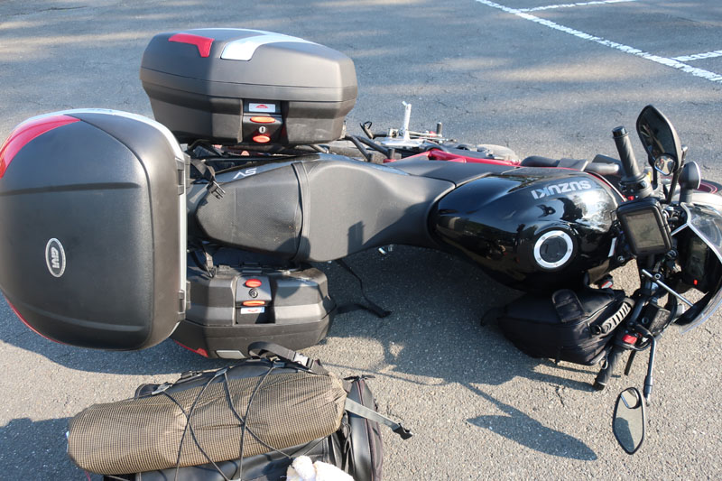 サイドケースに荷物を詰め込んでいたのと、坂が思った以上に急だったことで、車体が傾き始めると止めることができずに完全に力負けした。倒れる前に何とか踏ん張ったのと、サイドケースが見事に車体をカバーしてくれたおかげで被害は最小限で済んだはず。