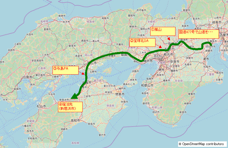 | 四日市を出たあと、ナビに案内されるがままの最短ルートを走ったが、国道477号は峠の連続で朝早くから疲れてしまった。(明るいうちの峠であれば楽しいが夜に峠を走るのはしんどい) 本来は国道306号から国道1号に出て京都方面に向かうべきだった。ルート選びというのは本当に難しい。 |