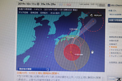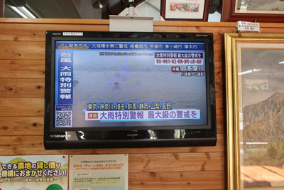 | 湯之平展望所までのルートを確認していたら、テレビで台風情報が入ってきた。関東は大雨特別警報が出ていて危険な状態らしい。(こんなときにツーリングをしていて申し訳ない) |