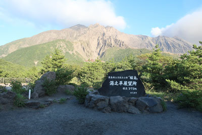 | ぐんぐん、山道を登ってほどなくして湯之平展望所へ到着。少し噴火の後が見えるが桜島の形が綺麗だねと眺めていると・・・ |