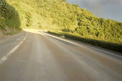 | 桜島に入った途端に道路が灰で汚れている。前方も黒い粉塵が飛んでいるがあれは火山灰? |