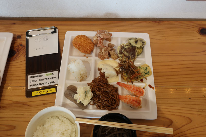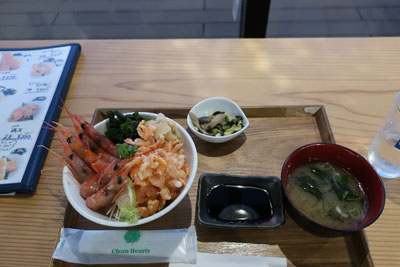 | 少し早いが、この道の駅で夕食を取ることにした。中で併設されている食事処でエビ食べくらべ丼を頼んでみたが、値段(1400円、税別)の割に味はイマイチ。完全に失敗。 |