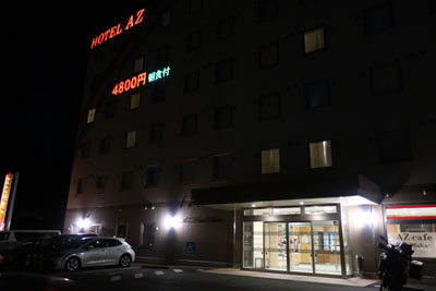 食事が終わって、道の駅の真横にあるホテルAZ垂水へ。ホテルAZは九州では有名なチェーン店で駐車場が必ず無料で用意されていることと、朝食無料、1泊4800円(税別。会員になれば4500円)とリーズナブルでライダーにとってもかなり使い勝手がいいホテル。バイクも何台か停まっているようだ。 |