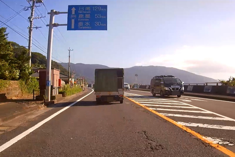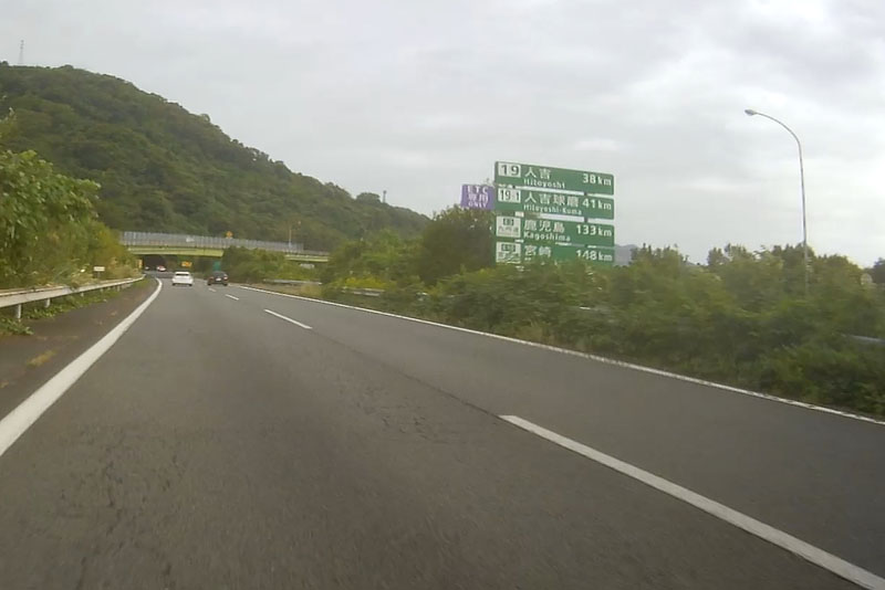 八代を越えて人吉までの看板が見えてきた。熊本県もかなり南下してきたが、空はまだ相変わらずの状況。所々、青い空は隙間から見えていたんだけど・・・。ここから先は九州山地をガッツリ抜けるので、トンネルの連続となる。トンネルを抜けたら青い空が、というシナリオが頭の中を駆け巡る。