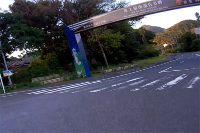 | 人気のない道を走ってきて佐多岬の入り口へ。8年前に来たときはこんな立派な門はなかった。料金所の建物は完全になくなったようだ。 |
