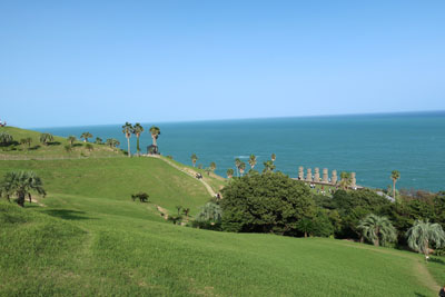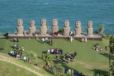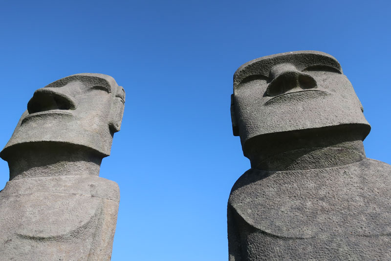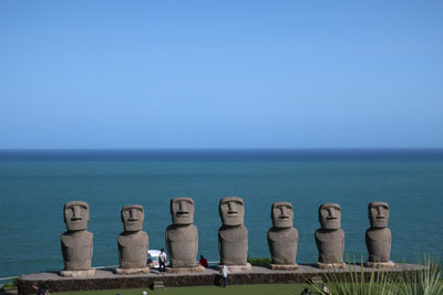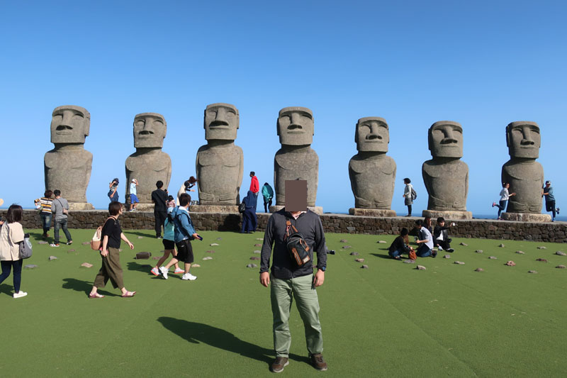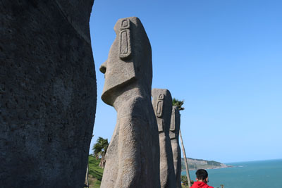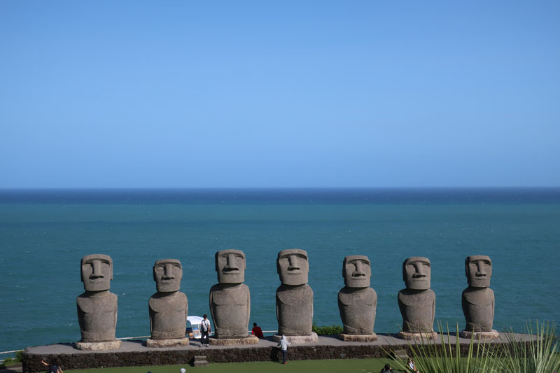 | これが世界で唯一のイースター島公認のモアイ像。なぜ、宮崎にモアイがいるのかって?それはよくわからないが、こんな景色を拝めるのは日本でここしかないのでとても貴重なのだ。よーし、モアイ尽くしだ! |