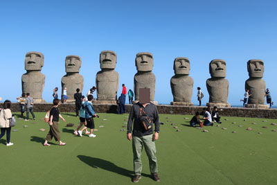 | 相棒も実物のモアイ像をみてマジメに感動していた。天気が良ければここは最高の観光スポットだと思う。 |