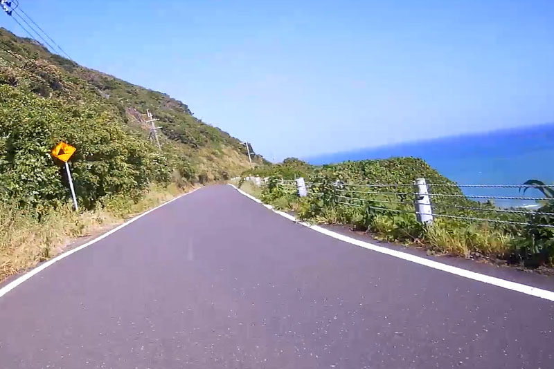 | 先に進むと、写真だとわかりづらいが、凄い断崖絶壁を通っているよ、ここ。2016年7月に家族旅行で都井岬に来たときはこの道は通行止めだった。 |