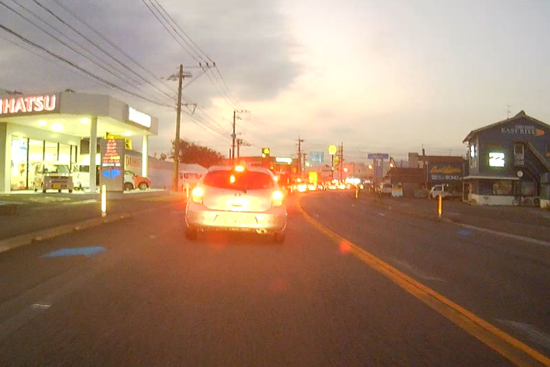| 宮崎市を何とか抜けて18時を過ぎて段々と暗くなってきた。国道10号は市街地を通るところが多く、ツーリングには不向きな道だが、北上する道は基本、これしかない。 |