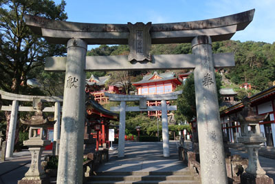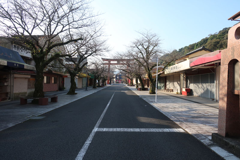 鳥居から神社に向かう。周りの店はまだほとんど空いていないようだ。相棒曰く、正月はまともに歩けないほど混雑するとのこと。 |