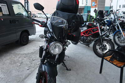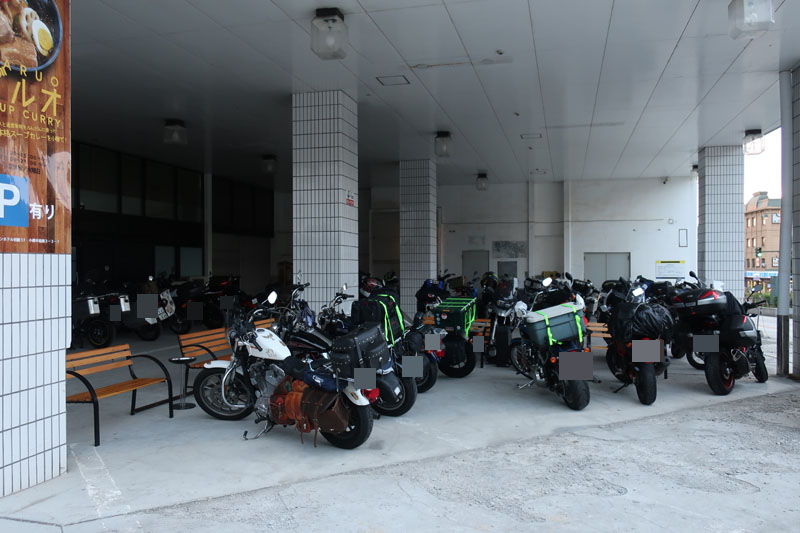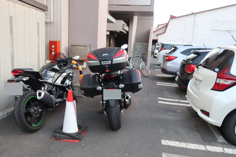 | 今日の宿泊先はコンフォートホテル北見。バイクは駐車場の隅のほうに停めるように指示されたので写真の場所へ。写真には写っていないが相棒は奥の隙間へ。ボクの隣のバイクは神戸ナンバーだ。 |