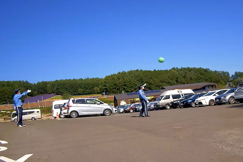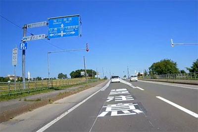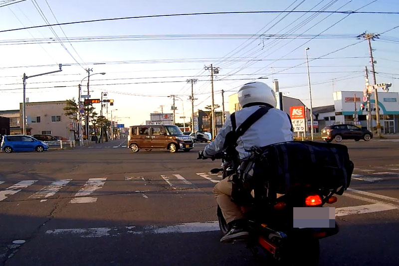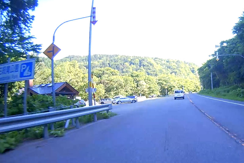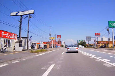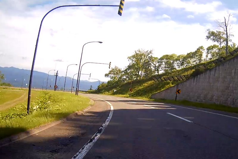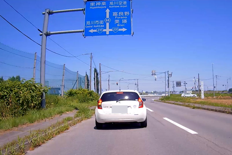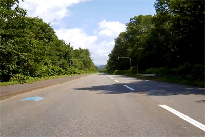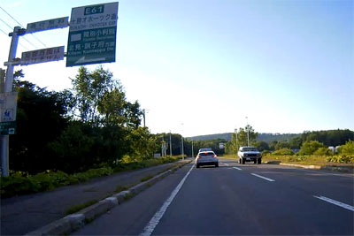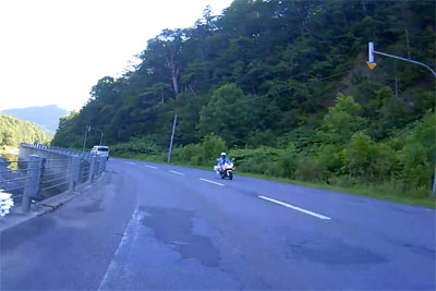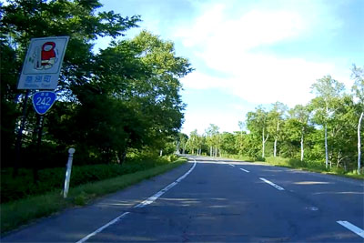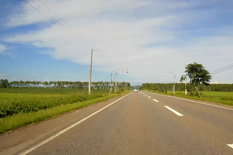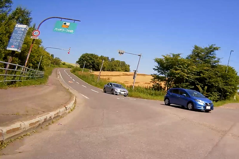 | そういった道なのでスピードが出てしまいがちになるが、このように白バイが突然出てくるので注意が必要。ただ、北海道の人は皆、ハイペースなのが実態だ。 |