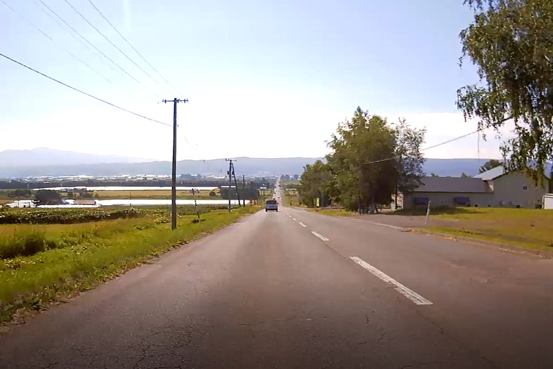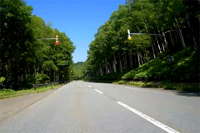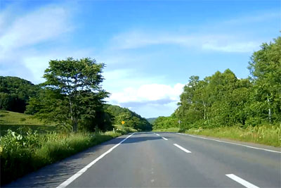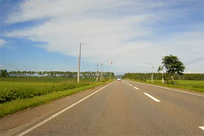 | 北の森ガーデンを抜けて再び層雲峡に向かう。国道273号との交差点を過ぎたあたりから一直線の道が多くなってきた。 |