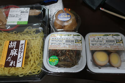 結局、迷いに迷った挙句、ホテル近くのセイコーマートで夕飯を購入。(T_T) まあ、相棒は北海道にしかないセイコーマートが好きらしいからまんざらでもなさそうだけど、ボクは少し寂しい。でもキンピラごぼうや煮玉子は意外に美味しそうだ。 |