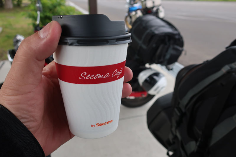 少し体が冷えているのでセイコーマートでホットコーヒーを購入。今やライダーにとって強い味方のコンビニコーヒー。体が冷えたときはこれで暖を取るのが定番だ。 |