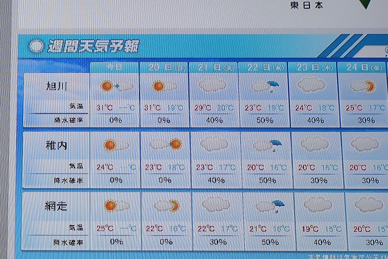 今日明日は問題ないが、問題は火曜日以降。道央や道南は天気が崩れるが、道北や道東は何とかなりそうな感じ。天気を見て都度行き先を変える高度な判断が必要になりそうだ(笑) |