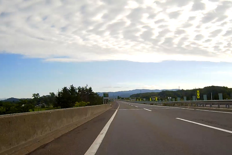 | この時間帯は一般道でもクルマが皆無なので高速道路であれば尚更でクルマをほとんど見かけない。真夏だが早朝なので、メッシュジャケットだとちょっと肌寒いぐらい。 |