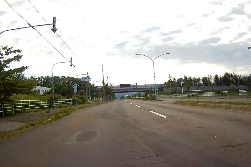 インターチェンジを降りて最初に目に入るのは矢印式のスノーポール。北海道を感じるのはセイコーマートとこのスノーポールの2つ。前にも書いたが、北海道はこのスノーポールが市街地以外はすべての道路に等間隔に設置されている。(冬季は必需品ということ) |