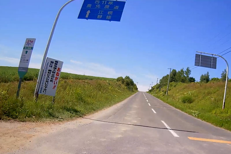 | 途中、国道237号から左折して西11線 農免農道へ。案内板もなくナビに導かれるまま左折したが、左に「ジェットコースターの路」の看板があるのでこの道で間違いなさそうだ。 |