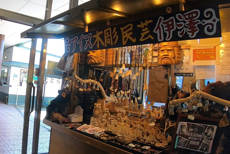 飲食店はパッとしない蕎麦やうどんしかなく、土産物も白い恋人など北海道ならどこでも売っているものばかりでこちらもパッとせず。ただ、アイヌ民芸品は北海道らしく少し興味を引いた。 |