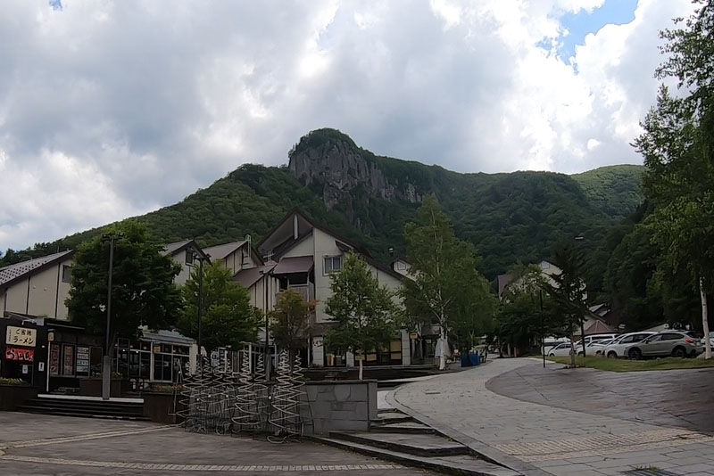 | 実はあまり下調べをしておらず、どのあたりが層雲峡の見どころかわからなかったので、とりあえず公共駐車場へバイクを停車して辺りを歩いてみる。目の前の山が大雪山? |