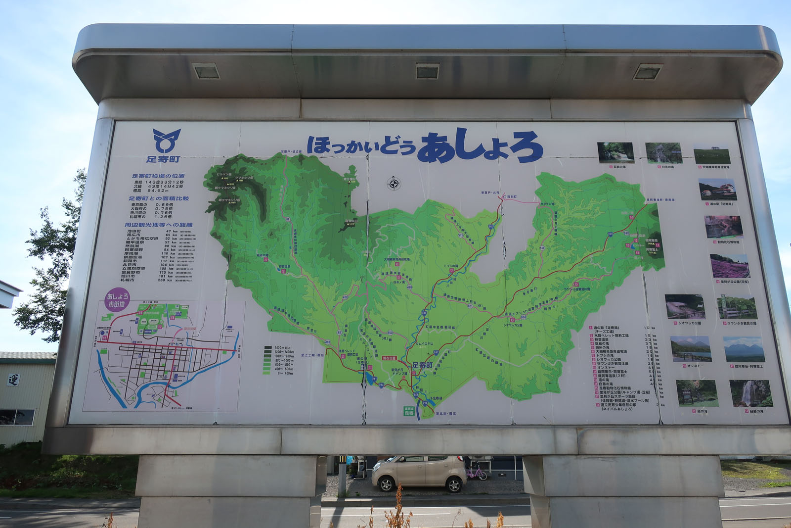 足寄の案内板。こうやってみると面積が巨大。東京都の0.69倍、大阪府の0.75倍、香川県の0.76倍。香川県は除いて人口は1000分の1といったところだろうから、足寄があまりに人がいなさすぎるのか、東京や大阪があまりに人が多すぎるのか、両方とも極端でよくわからない。
